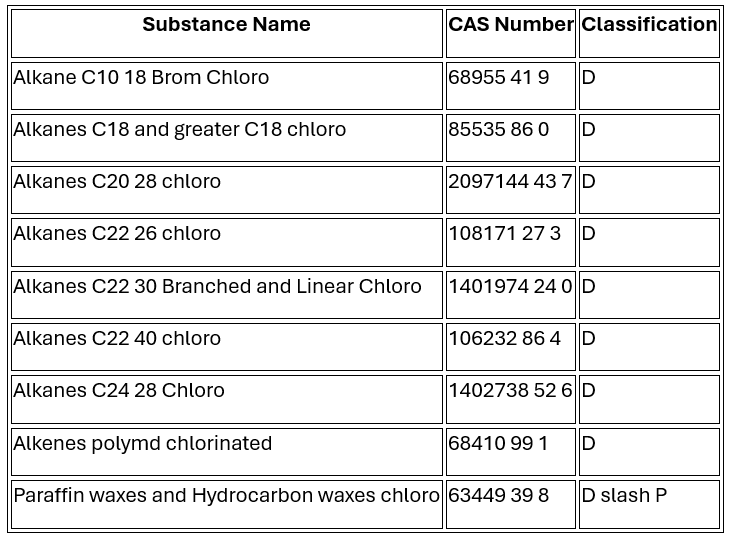 This change includes new substances flagged due to potential classification as Medium Chain Chlorinated Paraffins MCCPs which are increasingly regulated due to environmental and health concerns