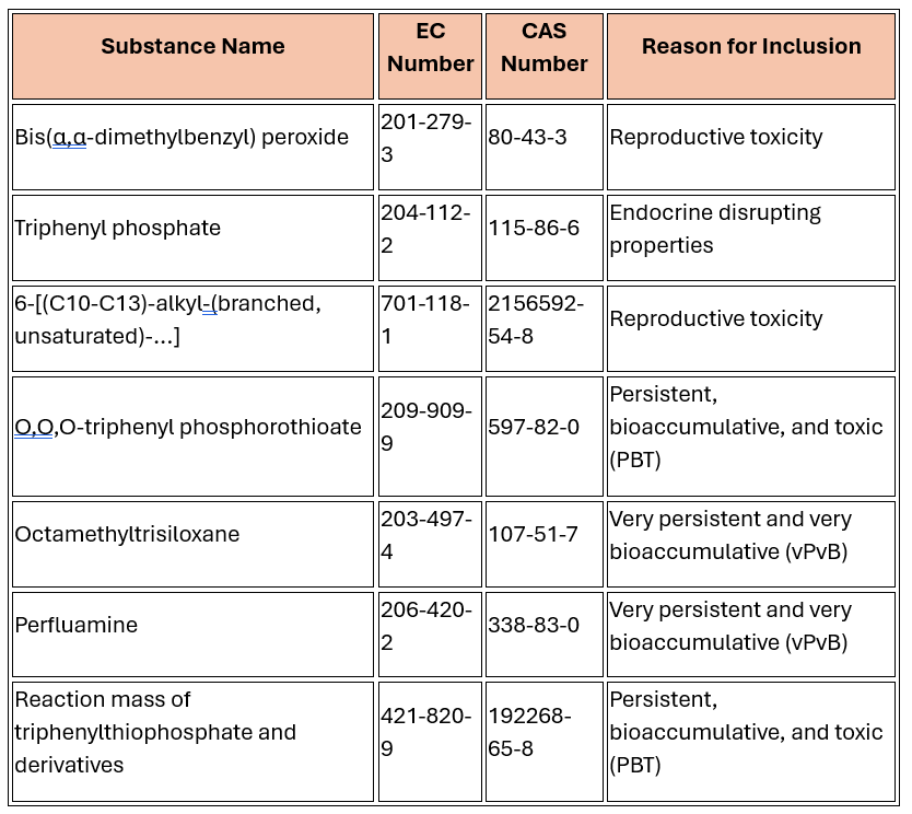 • Annex 3: Expanded and revised Candidate List of SVHCs, increasing total entries to 247 from 240.
